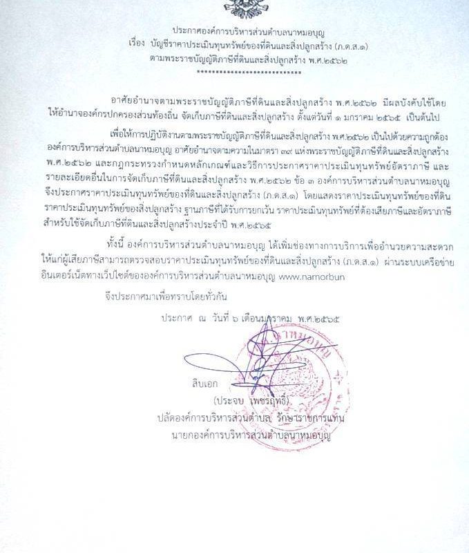 ประกาศองค์การบริหารส่วนตำบลนาหมอบุญ เรื่อง บัญชีราคาประเมินทุนทรัพย์ของที่ดินและสิ่งปลูกสร้าง (ภ.ด.ส.๑) ตามพระราชบัญญัติภาษีที่ดินและสิ่งปลูกสร้าง พ.ศ.๒๕๖๒ 7 มกราคม 2565อบต. นาหมอบุญ 2ประกาศ ภสด1, งานพัฒนารายได้ ภดส1 65