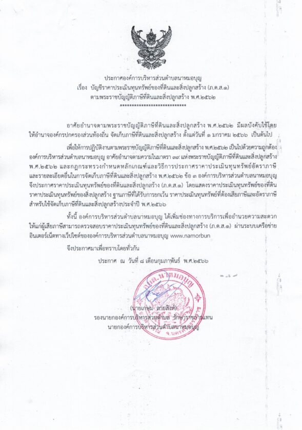 เรื่อง บัญชีราคาประเมินทุนทรัพย์ของที่ดินและสิ่งปลูกสร้าง (ภ.ด.ส.๑) ตามพระราชบัญญัติภาษีที่ดินและสิ่งปลูกสร้าง พ.ศ.๒๕๖๒
