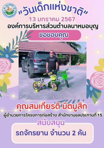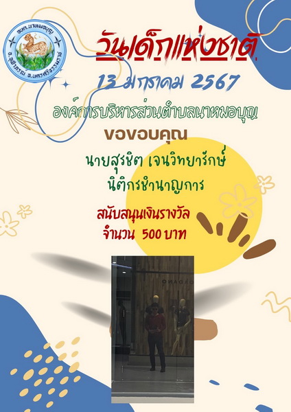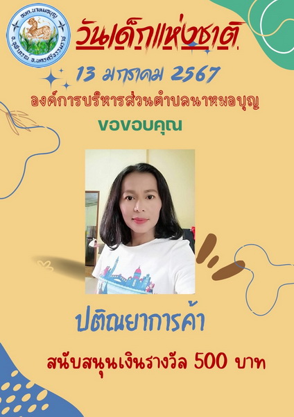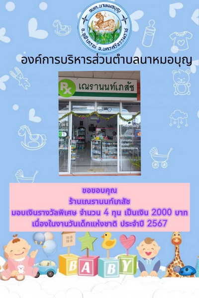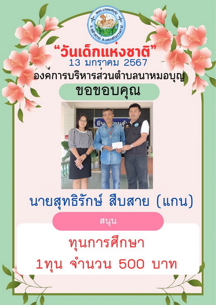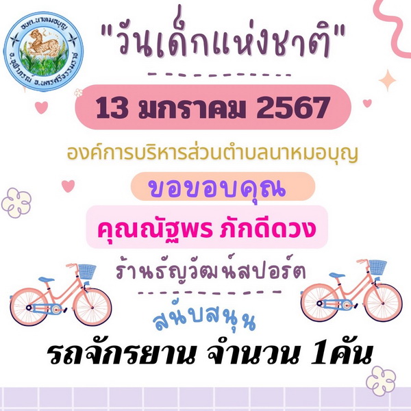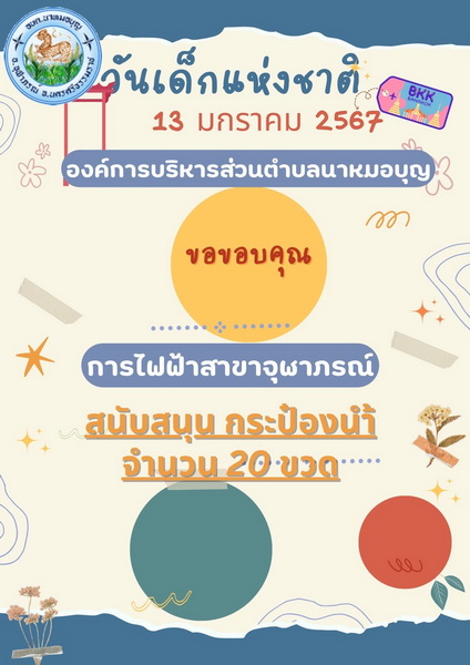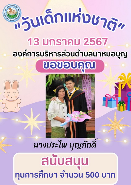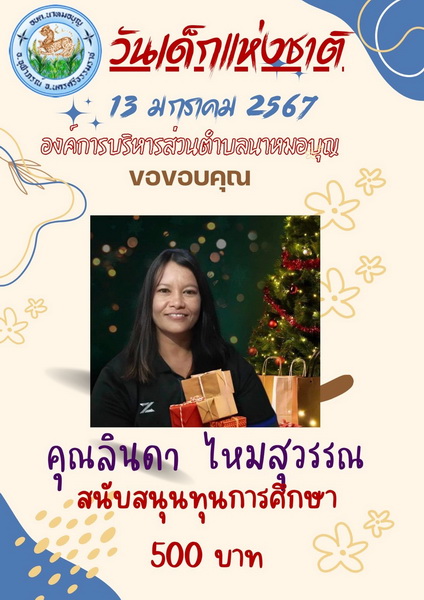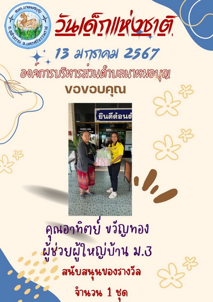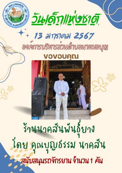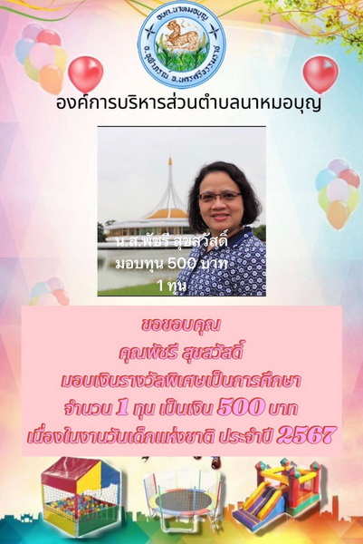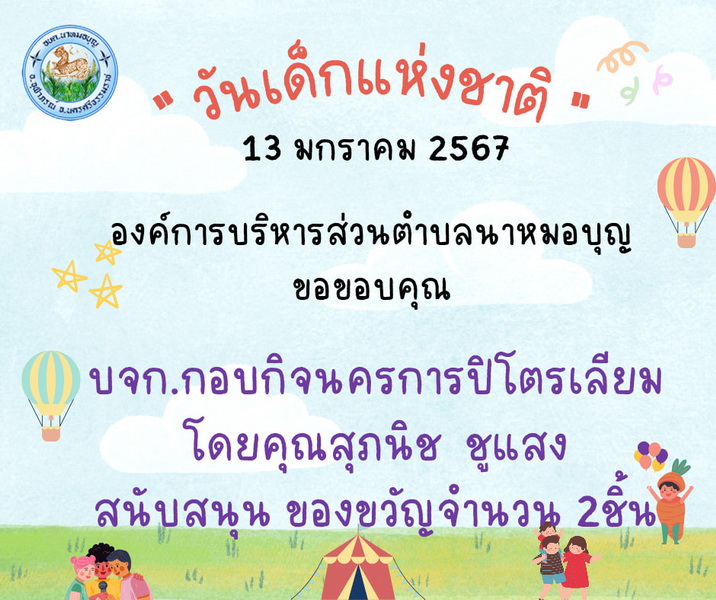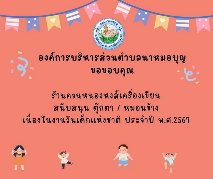 อบต.นาหมอบุญ ขอขอบพระคุณผู้ใหญ่ใจดี ที่ให้การสนับสนุนของขวัญ วันเด็กแห่งชาติ ประจำปี พ.ศ.๒๕๖๗ จึงประชาสัมพันธ์ให้ทราบโดยทั่วกัน