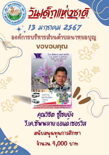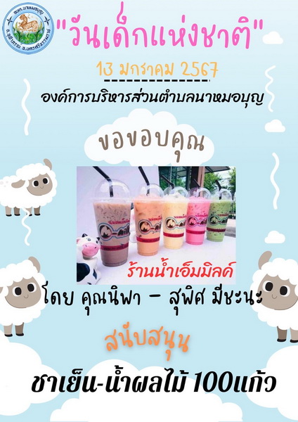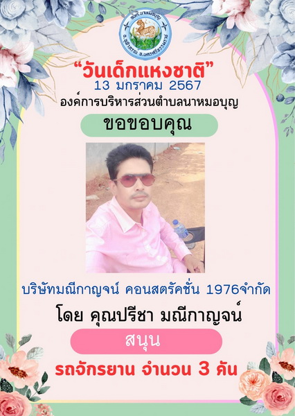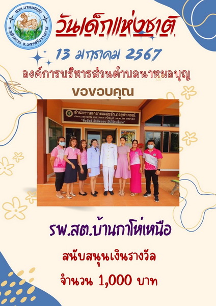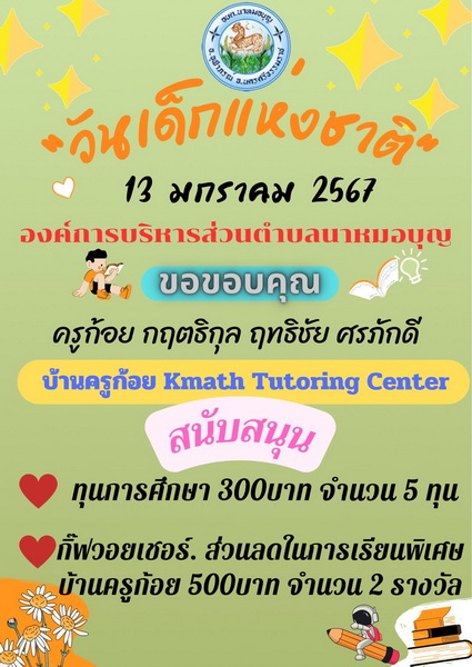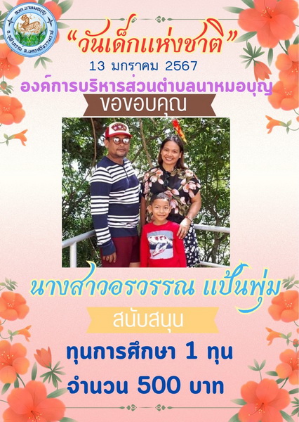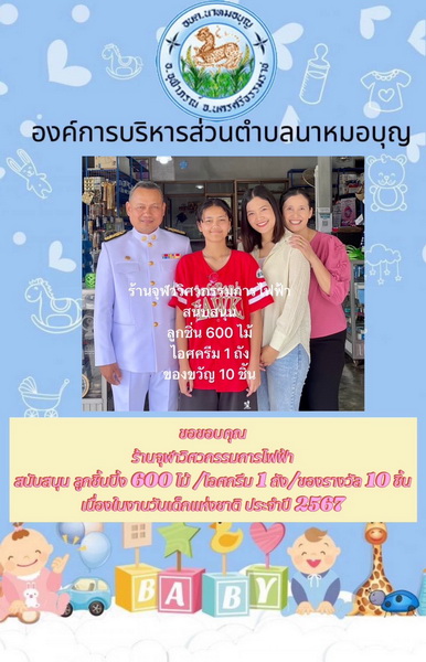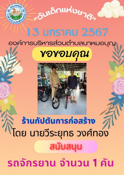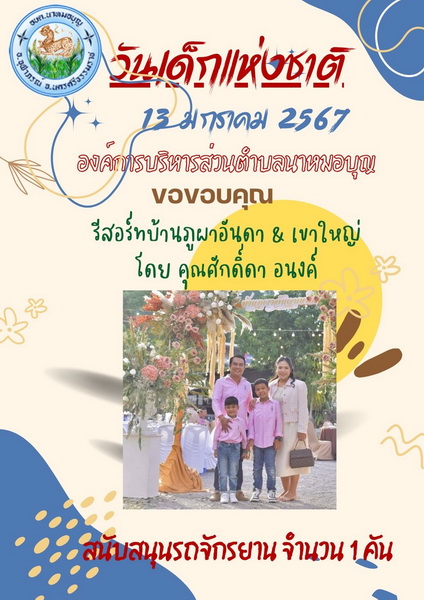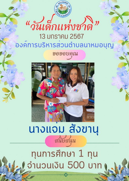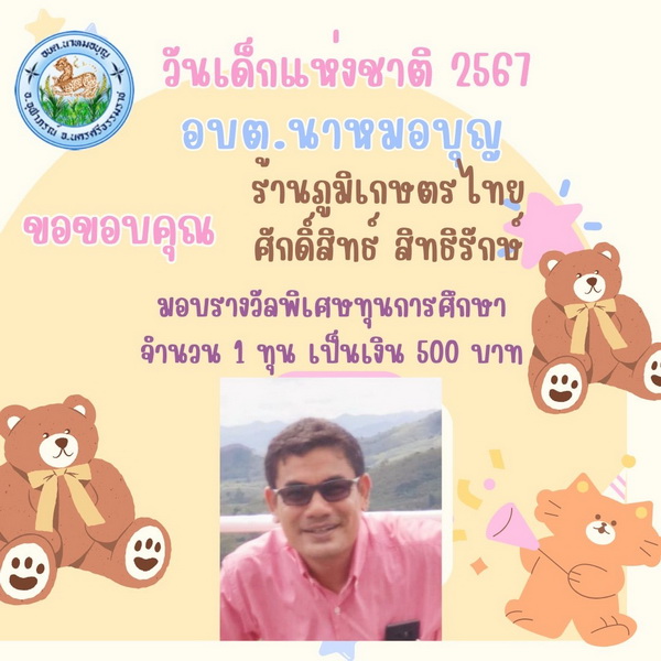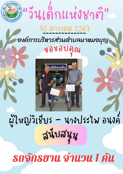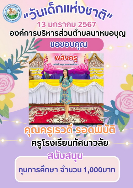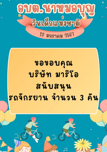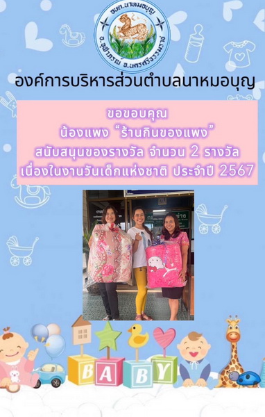 อบต.นาหมอบุญ ขอขอบพระคุณผู้ใหญ่ใจดี ที่ให้การสนับสนุนของขวัญ วันเด็กแห่งชาติ ประจำปี พ.ศ.๒๕๖๗ จึงประชาสัมพันธ์ให้ทราบโดยทั่วกัน