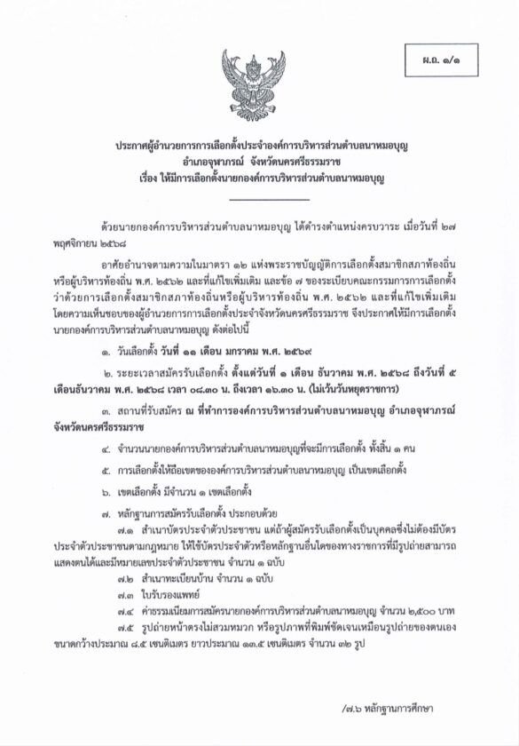 ประกาศเรื่องให้มีการการเลือกตั้งนายกอบต.นาหมอบุญ